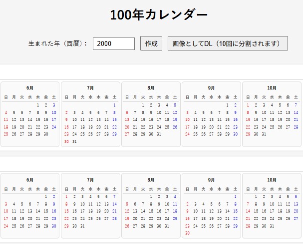 100年カレンダーを自分の生年に合わせて作成することができるサイトツールです。