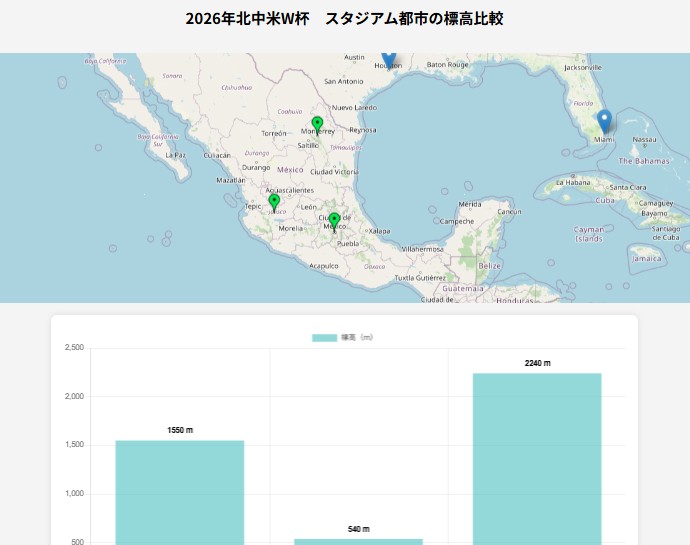 2026年の北中米ワールドカップで使われる都市(スタジアム)の標高を、地図上とグラフで比較できるサイトツールです。