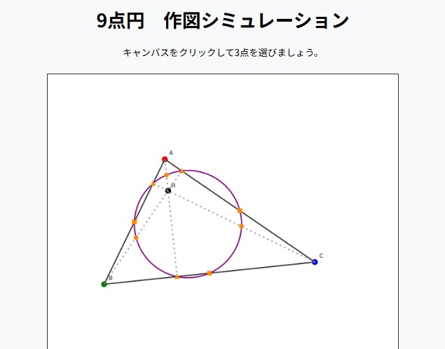 三角形の性質として有名な九点円(9点円)を、自由に置いた3点から描いてくれるサイトツールです。