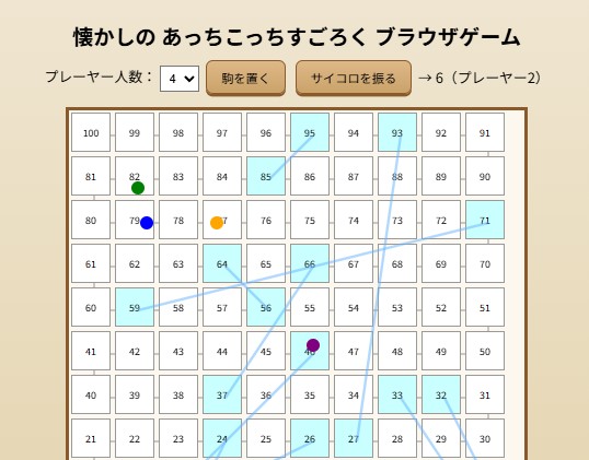 強制ジャンプのあるマスに止まることであちこちに飛ばされる感覚が楽しめる『あっちこっちすごろく』を、ブラウザゲームとして再現しました。