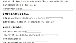 ドレイクの方程式で運命の人・理想の恋人の人数を計算するサイトツールです。各パラメータを入力してボタンを押すだけで自動計算できます。上の埋め込み内でも使えますが、うまく動かない・大きなページで使いたいというときは、元のドレイクの方程式で運命の...