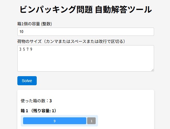 ビンパッキング問題を自動で解いてくれる無料サイトツール(ソルバー)です。箱一つの容量と、荷物のサイズを入力するだけで答えを出してくれます。