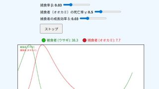 サイトツール ロトカ=ヴォルテラモデルwebシミュレーション-グラフで捕食者と被捕食者の関係がわかる! 自然界における捕食者と被食者の個体数の変動を表すロトカ=ヴォルテラモデルのシミュレーションをウェブ上で実行し、個体数の変動を観察できるサイトツールです。上の埋め込み内でも使えますが、うまく動かない・大きなページで使いたいというときは、元のロ... 2025.09.24 サイトツール