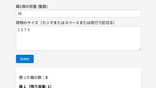 サイトツール ビンパッキング問題 自動解答サイトツール ビンパッキング問題を自動で解いてくれる無料サイトツール(ソルバー)です。箱一つの容量と、荷物のサイズを入力するだけで答えを出してくれます。上の埋め込み内でも使えますが、うまく動かない・大きなページで使いたいというときは、元のビンパッキング問... 2025.09.26 サイトツール