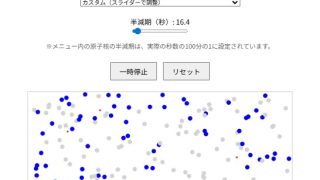 サイトツール 半減期webシミュレーション-元素を選んで半減期が観察できる! 半減期を設定して、その通りに原子核が崩壊していく様子をウェブ上で観察できるシミュレーションツールです。元素を選ぶか、スライドバーで自由にその半減期を設定できます。上の埋め込み内でも使えますが、うまく動かない・大きなページで使いたいというとき... 2025.09.28 サイトツール