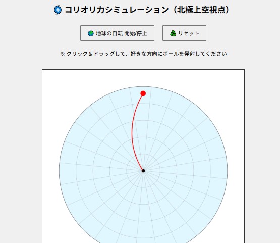 このツールは、北極の真上から地球を見下ろした視点で、コリオリ力の効果を視覚的に体験できるブラウザアプリです。
