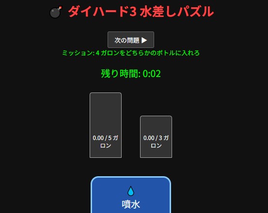 - どちらかの容器にちょうど目標の量の水が入ったら、爆弾解除成功!