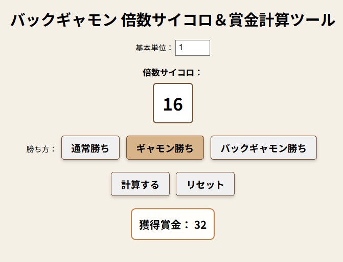 このツールを使えば、バックギャモンの倍数サイコロが手元にない場合でも、簡単に倍率を管理しつつ勝者の獲得賞金を計算できます。