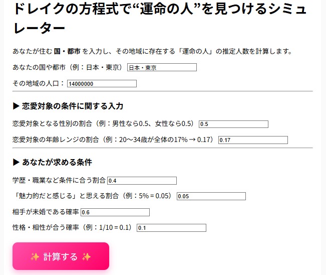 ドレイクの方程式で運命の人・理想の恋人の人数を計算するサイトツールです。各パラメータを入力してボタンを押すだけで自動計算できます。