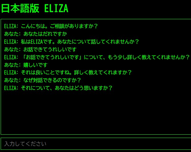 - 入力欄にテキストを入力し、Enterキーまたは「送信」ボタンを押す(またはエンターキーで送信)と、ELIZAが返答します。