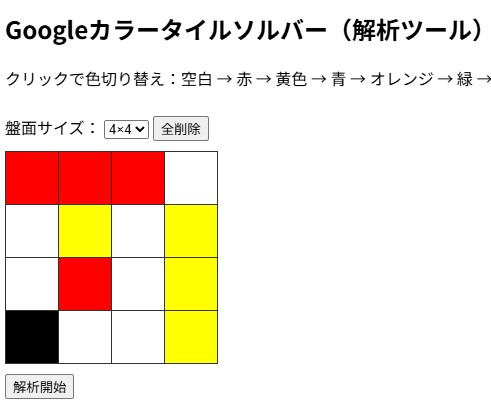 上の埋め込み内でも使えますが、うまく動かない・大きなページで使いたいというときは、元のGoogleカラータイルソルバーページへ(新しいタブで開きます)。
