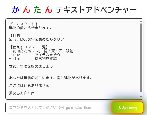 上の埋め込み内でも遊べますが、うまく動かない・大きい画面で遊びたいという方は元のかんたんテキストアドベンチャーゲームページへ(新しいタブで開きます)。