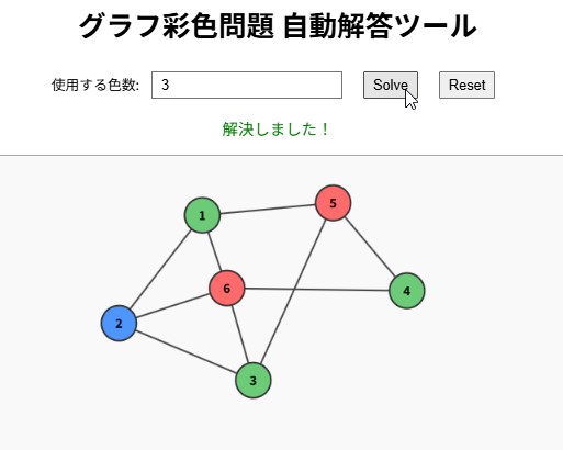 上の埋め込み内でも使えますが、うまく動かない・大きなページで使いたいというときは、元のグラフ彩色問題自動解答ツールページへ(新しいタブで開きます)。