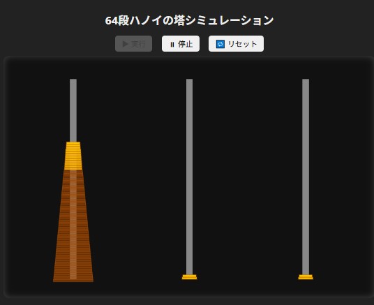 上の埋め込み内でも使えますが、うまく動かない・大きなページで使いたいというときは、元のハノイの塔64段シミュレーションページへ(新しいタブで開きます)。