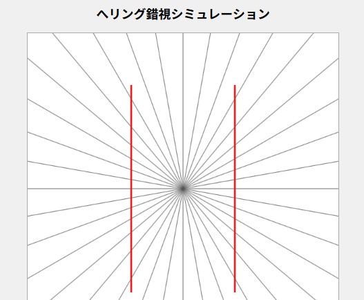このシミュレーションツールでは、赤色の垂直平行線と、中心から放射状に広がる斜線を組み合わせてへリング錯視を再現します。