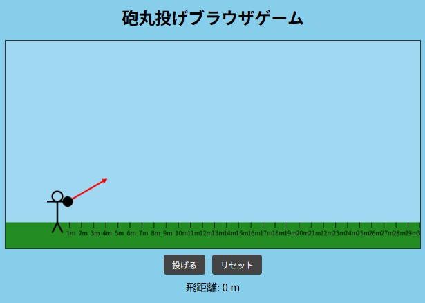 このゲームは、HTML5とJavaScriptで作られたシンプルな砲丸投げシミュレーションです。