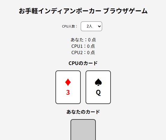 トランプのインディアンポーカーを手軽に遊べるように調整したブラウザゲームです。相手のカードを見て、自分のカードを変更することができます。
