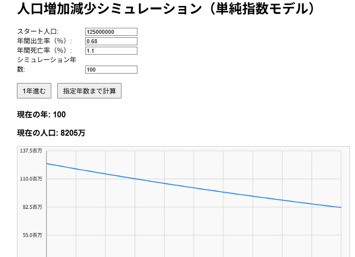 - スタート人口:シミュレーションを開始する人口を入力(例:1億2500万人)