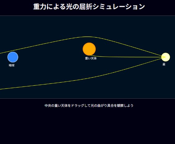 一般相対性理論の重力による光の屈折について、ウェブ上でシミュレーションを実行し、光が屈折する様子を観察できる無料サイトツールです。