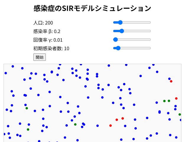 このツールでは、SIRモデルを「粒子」として画面上に表示し、インタラクティブに観察できます。人々がランダムに動きながら接触し、感染・回復していく様子を可視化します。