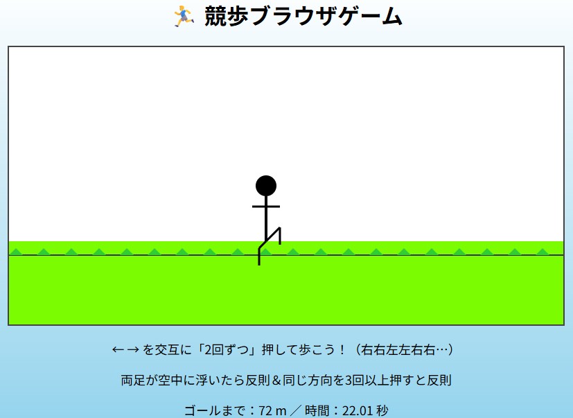 特別なソフト不要で、ブラウザ上で手軽にプレイできる競歩シミュレーションとして制作しました。