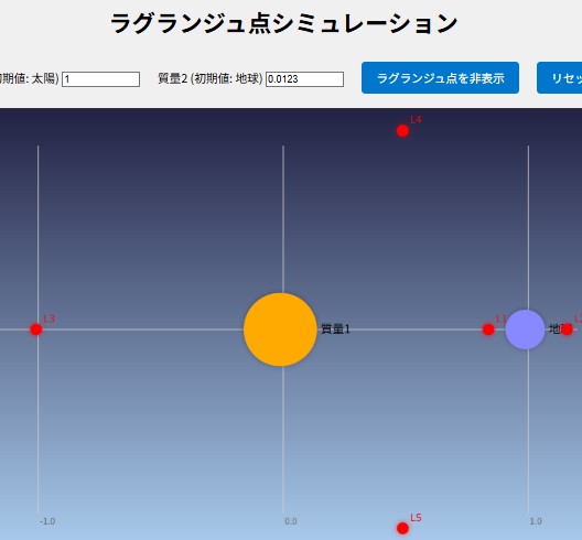 - 本ツールは、質量比を変えながらL1〜L5の位置をリアルタイムで描画できる教育的シミュレーションです。