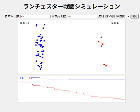 このシミュレーションでは、ブラウザ上で青軍と赤軍を設定し、ランチェスター法則に基づく戦闘を体験できます。
