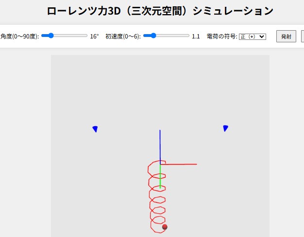 三次元空間でのローレンツ力のシミュレーションをブラウザ上で行い、円運動や螺旋運動が観察できるサイトツールです。初速や発射角度を調整できます。