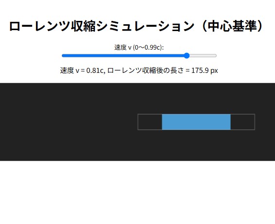 特殊相対性理論で予測される「ローレンツ収縮」のシミュレーションをウェブ上で実行し、長さが縮む様子を観察できるサイトツールです。