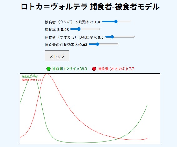 自然界における捕食者と被食者の個体数の変動を表すロトカ=ヴォルテラモデルのシミュレーションをウェブ上で実行し、個体数の変動を観察できるサイトツールです。