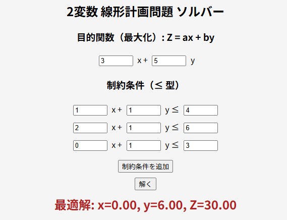 このアプリケーションは、2変数(x, y)で構成される線形計画問題(LP)を、ブラウザ上で解くためのシンプルなツールです。
