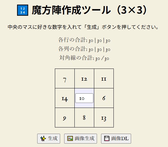 自分で選んだ数字で3×3の魔方陣が作れるサイトツール(魔方陣メーカー)です。魔方陣は画像化してダウンロードもできます。