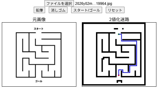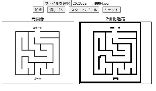 - 「迷路アップロード」ボタンから白黒迷路の画像を選択します。