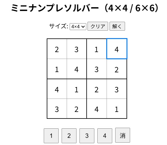 「ミニナンプレソルバー」は、4×4および6×6の小さな数独(ナンプレ)をブラウザ上で簡単に作成・入力・解答できるツールです。