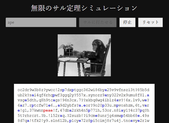 無限の猿定理を、サイト上に実装しました。自由に打ち込んだ文字列を、猿が適当にタイプライターを打つことで再現しようと試みます。