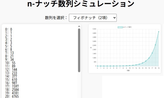これにより数列の成長や変化の様子を直感的に確認できます。 - 項数を変えたい場合は再度ドロップダウンから選択してください。グラフとテキスト表示が更新されます。