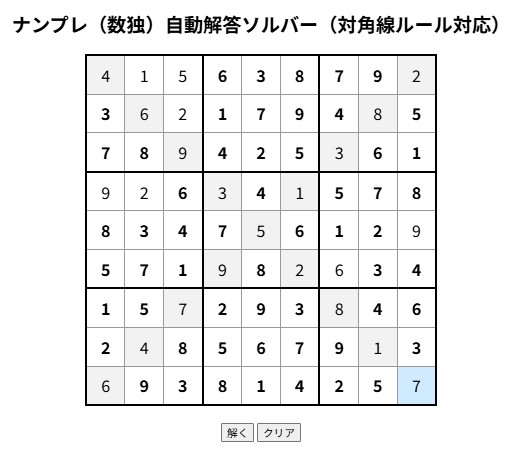 ナンプレ(数独)の自動解答サイトツール(ソルバー)です。盤面を入力するだけで、一瞬で答えを探索して表示してくれます。対角線も重複なしにする対角線ルールにも適応できます。