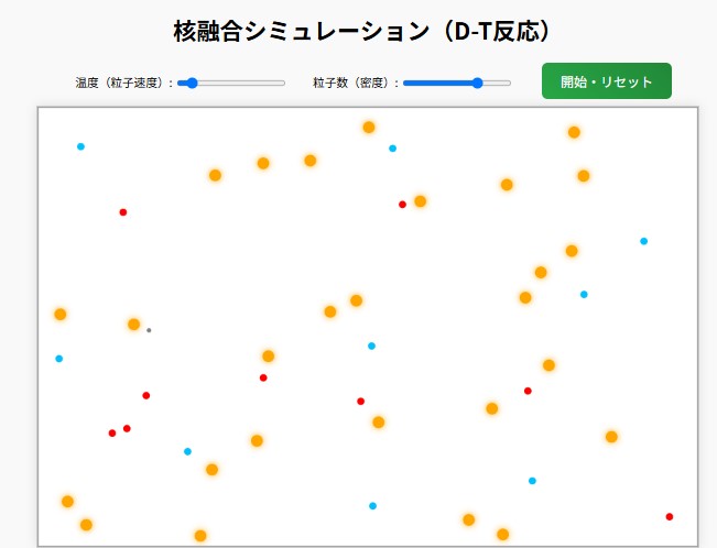 このwebシミュレーションでは、長方形の容器内で重水素(青)と三重水素(赤)の粒子がランダムに動き、一定距離以内で接触するとD-T反応によりヘリウム(オレンジ)を生成する様子を可視化しています。
