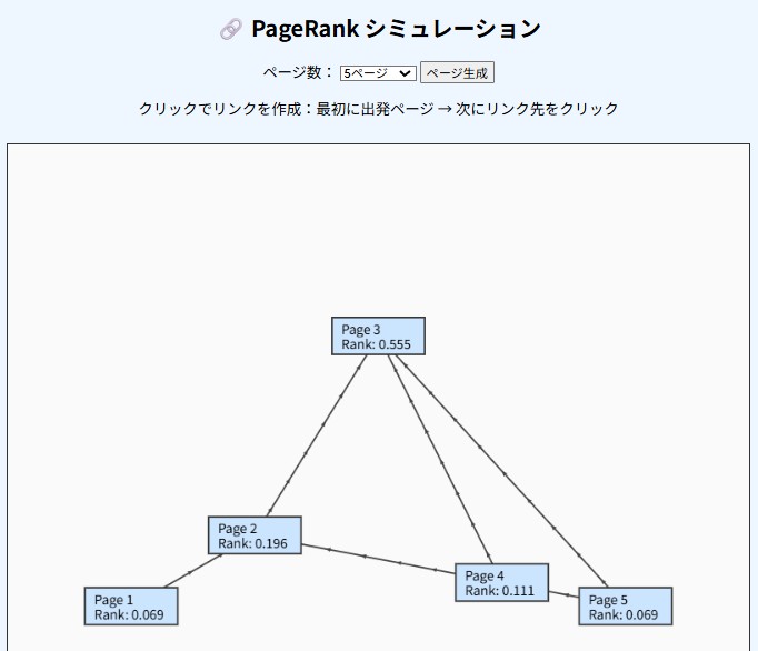 このツールを使うことで、リンク構造がページランクに与える影響を直感的に理解できます。