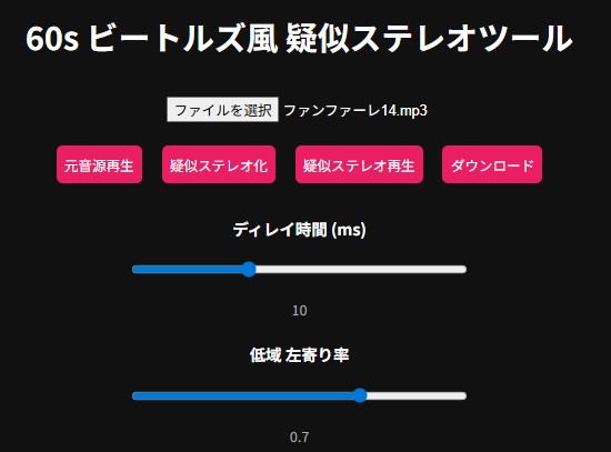 上の埋め込み内でも使えますが、うまく動かない・大きなページで使いたいというときは、元の60年代の疑似ステレオ化ツールページへ(新しいタブで開きます)。