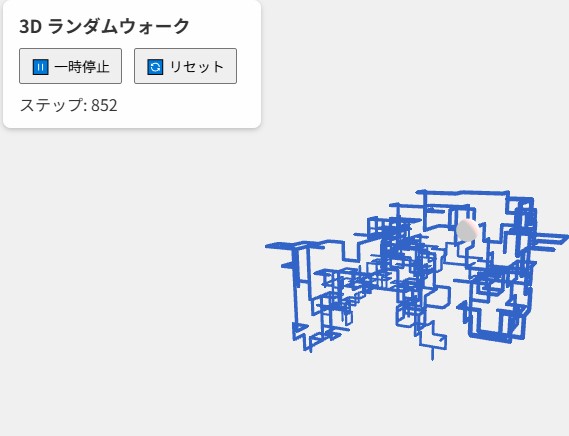 「開始」ボタンを押すと、3D空間内でウォーカー(粒子)がランダムな方向に動き始めます。