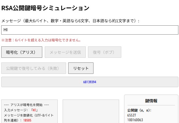 公開鍵暗号の代表格であるRSA暗号のシミュレーションをウェブ上で実行し、仕組みを理解できるサイトツールです。