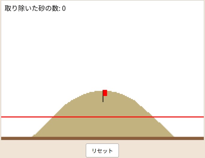 画面上には山のように積み上がった砂が表示されており、中心には赤い旗が立っています。