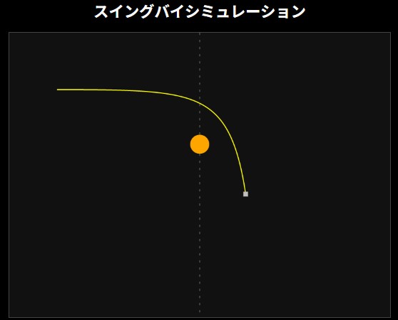 このページのシミュレーターは、シンプルなスイングバイの原理を視覚的に理解するためのツールです。以下の手順で操作できます。
