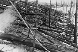空中に巨大な閃光とともに爆発が発生。爆心地周辺2,000km²の森林がなぎ倒されました。