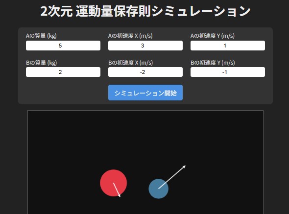 平面でも運動量保存則のシミュレーションをウェブ上で実行し、運動量が保存されている様子を観測できる無料サイトツールです。
