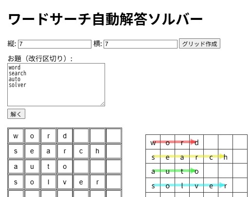 ワードサーチ自動解答ソルバーは、入力した文字グリッドの中から指定した単語を自動的に探し出し、見つかった単語を矢印付きのラインで可視化するツールです。