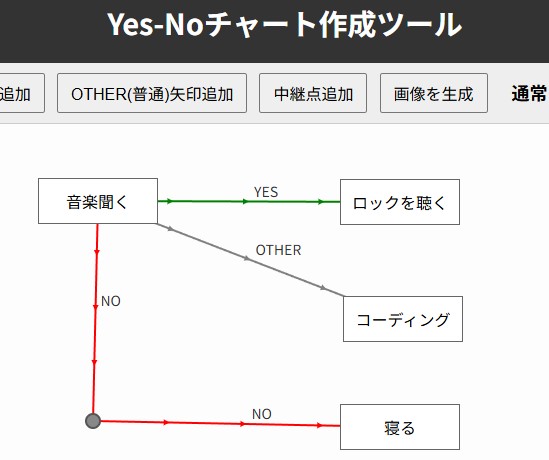 - テキストボックスをオ配置して、矢印でつなぐだけで直観的にYes-Noチャートが作成できるサイトツールです。